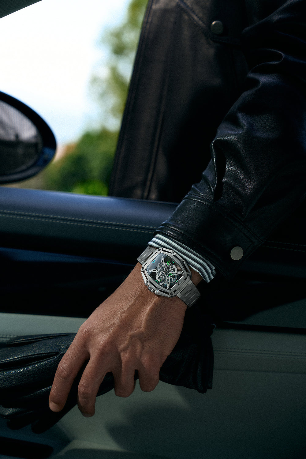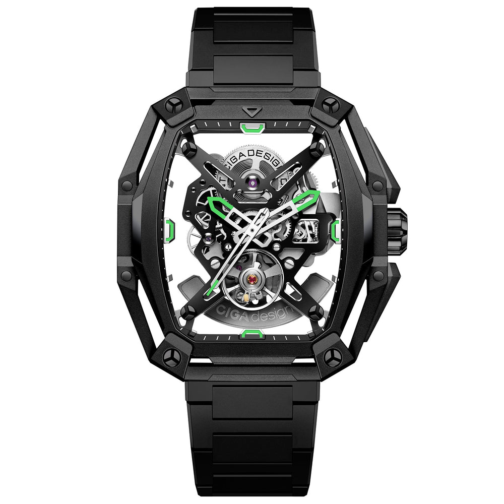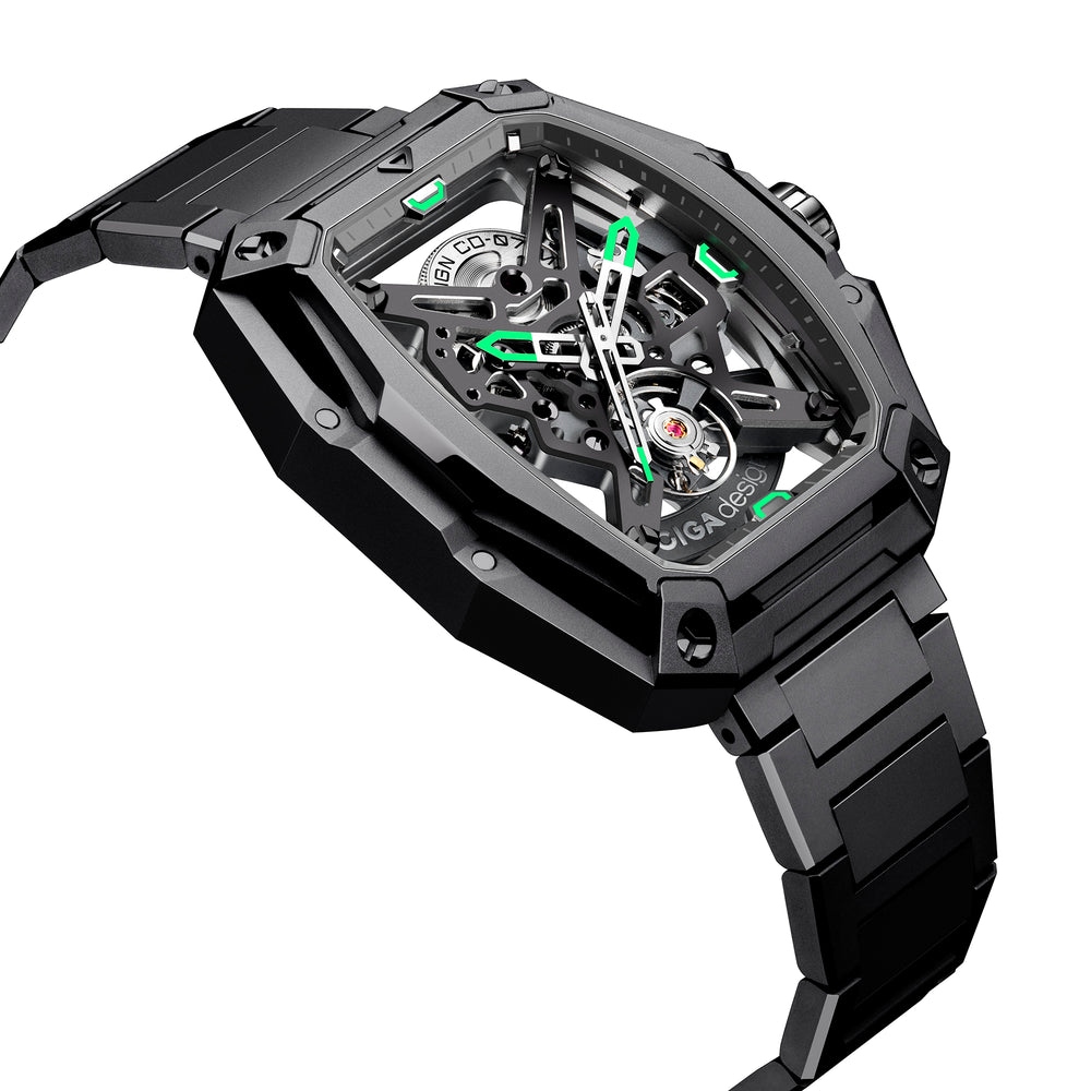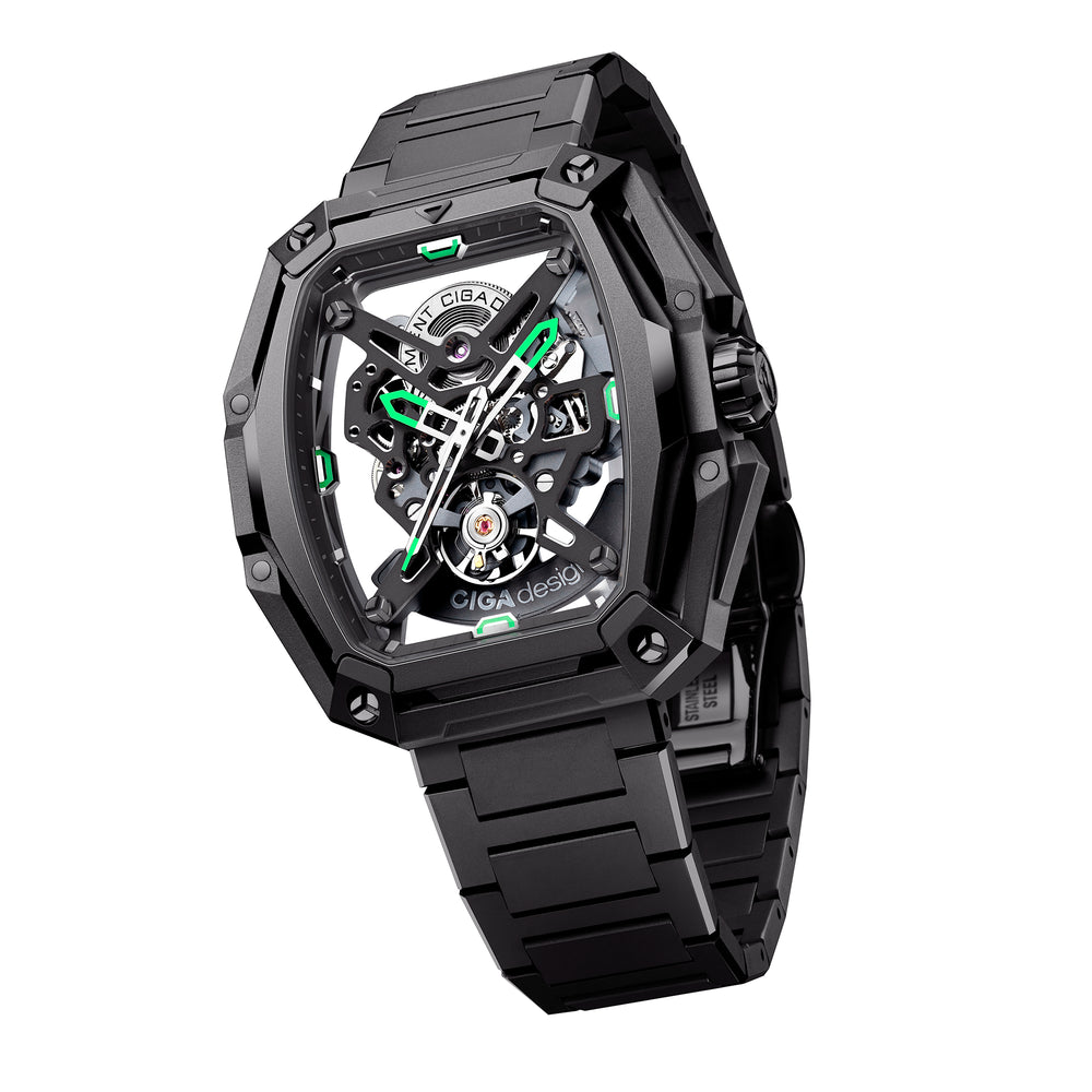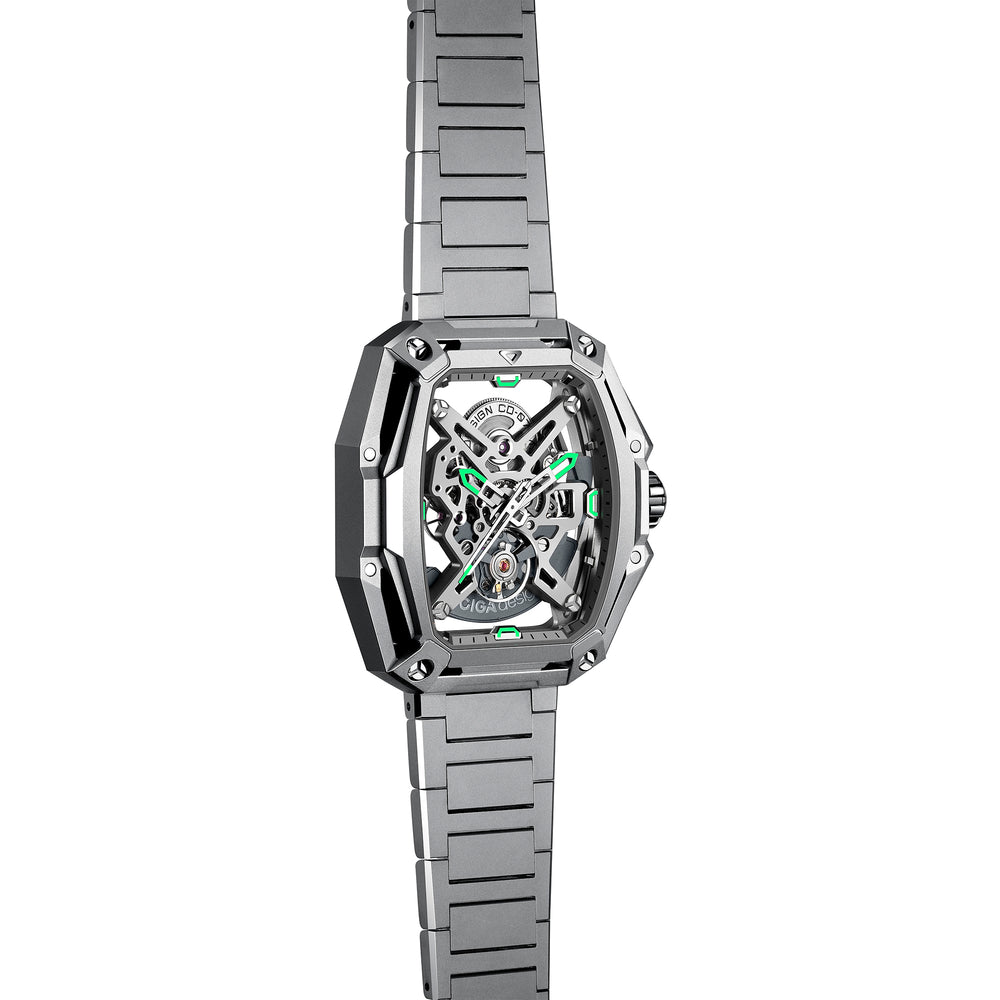 Forjada en acero 316L con recubrimiento DLC, combina una forma geométrica elegante con una durabilidad robusta.